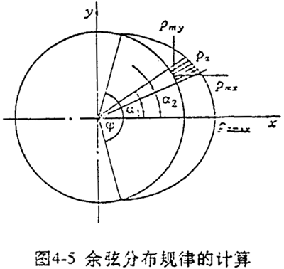 確定作用于結(jié)構(gòu)邊界上的非均布載荷是一件復(fù)雜工作,往往需要進(jìn)行一些較復(fù)雜的計算,譬如采用接觸問題有限元法進(jìn)行計算。在實際應(yīng)用中常采用一些近似的假設(shè)規(guī)律來代替這些復(fù)雜的未知分布規(guī)律。對于軸承載荷,一般假設(shè)沿周邊按余弦規(guī)律分布如圖4-5所示,即