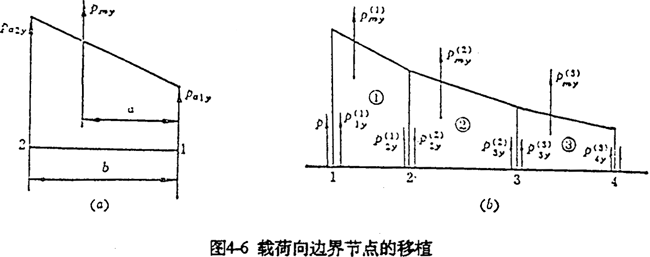 對于邊界上每一個微段,按上述方法計算完后,再對每一個邊界點處的力求和即得到邊界節(jié)點沿y向的載荷分量(圖4-6(b))。例如,對于邊界節(jié)點2,其節(jié)點載荷P2y為