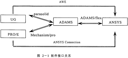 以上四個軟件均是當(dāng)今比較流行且功能強大的大型CAD/CAE軟件,然而考慮到ADAMS的內(nèi)核就是Parasolid,從UG中導(dǎo)入ADAMS的模型包含了在UG里定義的密度、質(zhì)量等幾何屬性,不需作任何變更就可使用;而PRO/E與ADAMS間通過Mechanism/pro模塊進行連接時存在較多的問題,經(jīng)過長時間的摸索才連通,且發(fā)現(xiàn)在PRO/E里南非先將各個零件定義為剛體,作為子裝配只能定義為一個剛體,可是像RV減速器這樣的大模型在裝配過程中不可避免地含有子裝配并且子裝配中的零件間有相對運動,將其定義為一個剛體是錯誤的,為此,本課題中采用了UG、ADAMS與ANSYS形成的分析平臺。