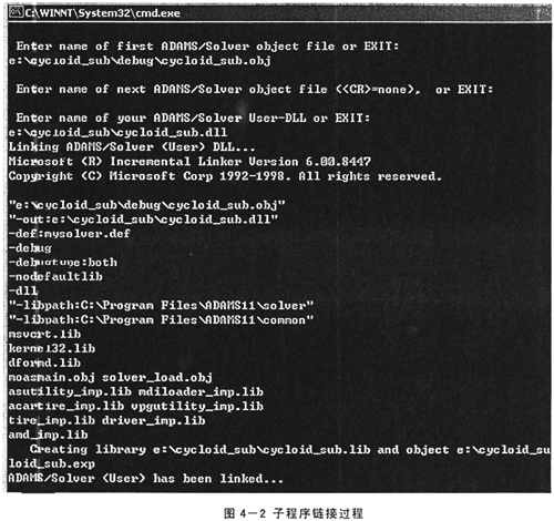 5)在背景模式(即命令提示模式)下,將上一步的目標(biāo)文件與ADAMS鏈接,生成可執(zhí)行的用戶庫(kù)(*.dll)。