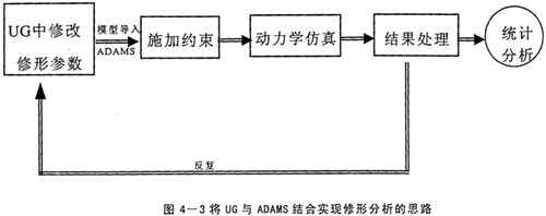 前面已經(jīng)以擺線傳輸線的參數(shù)化建模為例,闡述了UG的強(qiáng)大的基于特征的參數(shù)化造型功能,既然用子程序的方式實(shí)現(xiàn)不了,將UG的該功能加以充分利用,也可以實(shí)現(xiàn)優(yōu)化修形的目的。實(shí)現(xiàn)的途徑是在建造擺線輪的表達(dá)式中考慮修形量△Rz與△r,這樣就建造了修形后的擺線輪,同時(shí)△Rz與△r是隨機(jī)可調(diào)的變量,可以得到任意組合的修形方式。并且UG的數(shù)據(jù)存儲(chǔ)具有單一數(shù)據(jù)庫(kù)的特點(diǎn),零件圖中修改后,裝配圖及工程圖全都自動(dòng)更新,不用人工去費(fèi)時(shí)修改。然后,再將總裝配模型導(dǎo)入到ADAMS中施加約束。執(zhí)行仿真。這樣就得到多組修形組合的仿真結(jié)果,經(jīng)過統(tǒng)計(jì)分析就可得到最佳的修形組合。具體思路如下圖所示。