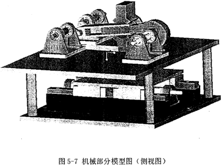 如圖5-1所示為實(shí)驗(yàn)系統(tǒng)機(jī)械部分的模型圖片,為了顯示清楚,沒(méi)有配置外邊的機(jī)箱,整個(gè)機(jī)構(gòu)是完全開(kāi)放式的,這樣也便于實(shí)驗(yàn)觀(guān)察。該機(jī)械結(jié)構(gòu)由上下兩個(gè)機(jī)架支撐,和前面的原理圖不同,下邊機(jī)架上放置昆旋導(dǎo)軌構(gòu)件(未顯示伺服電機(jī)),上邊機(jī)架則是上圖所示的其余連桿機(jī)構(gòu)及其支撐架、軸承等(未顯示常速電機(jī))。