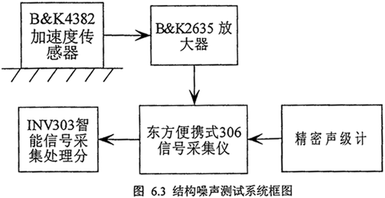 在測試產(chǎn)對(duì)所有的加速度傳感器,放大器及數(shù)據(jù)自動(dòng)采集處理系統(tǒng)進(jìn)行校準(zhǔn),對(duì)規(guī)定的所有測點(diǎn)進(jìn)行打磨,平磨并做好標(biāo)記,測試時(shí)在規(guī)定工況下依次將傳感器磁性底座放在各測點(diǎn)上。傳感器測得的振動(dòng)信號(hào)(包括速度級(jí)和加速度級(jí)振動(dòng)信號(hào))經(jīng)電荷放大器放大后進(jìn)入16通道卡式采集儀進(jìn)行采集記錄,用智能動(dòng)態(tài)信號(hào)分析儀分析各測點(diǎn)的1/3倍頻程度級(jí)結(jié)構(gòu)噪聲,再對(duì)所有的測點(diǎn)的結(jié)構(gòu)噪聲值做對(duì)數(shù)平均,得到總的結(jié)構(gòu)噪聲頻譜圖?諝庠肼曈寐暭(jí)計(jì)測量減速裝置各個(gè)測點(diǎn)的A計(jì)權(quán)聲壓級(jí)和1/1倍頻程聲壓級(jí)。各測點(diǎn)距齒輪箱測量表面的距離為1米。測試前已用標(biāo)準(zhǔn)噪聲源HY203-93260對(duì)聲級(jí)計(jì)進(jìn)行校準(zhǔn)。測試系統(tǒng)框圖如圖6.3所示。測試設(shè)備如下: