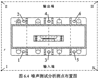 結(jié)構(gòu)振動(dòng)噪聲測試在齒輪箱安裝基腳布置6個(gè)測點(diǎn),測點(diǎn)布置圖見圖3中1-6測點(diǎn),在每一測點(diǎn)上按31.5Hz~5kHz1/3倍頻中心頻率測試加速度級(jí)頻譜(re:a0=10-6m/s)和1/3倍頻中心頻率測試速度級(jí)頻譜(re:a0=5*10-8m/s)?諝庠肼暅y試聲壓級(jí)基準(zhǔn)2*10-5Pa,用聲級(jí)計(jì)上的A計(jì)權(quán)聲壓級(jí)和1/1倍頻程聲壓級(jí)測量減速齒輪裝置各個(gè)測點(diǎn)。各測點(diǎn)距齒箱測量表面的距離為1米。測點(diǎn)位置見測點(diǎn)布置圖6.4中Ⅰ-Ⅳ測點(diǎn)。
