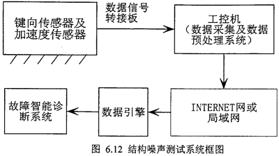 實(shí)驗(yàn)裝置共有兩大部分,一部分是實(shí)時(shí)監(jiān)測及數(shù)據(jù)采集,一部分是信號(hào)分析處理系統(tǒng)。其測試系統(tǒng)框圖如圖6.12所示。