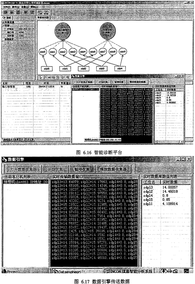 綜上分析,采用人機(jī)交互方式將Zdp14、Zdp15等參數(shù)輸入計(jì)算機(jī),智能診斷系統(tǒng)得到雙環(huán)減速器故障診斷結(jié)果,偏心軸彎曲故障,程度值在0~1范圍變化,齒形誤差較大。智能診斷結(jié)果如圖6.15所示。圖6.16是智能診斷平臺(tái)進(jìn)行現(xiàn)場一線診斷分析,圖6.17是數(shù)據(jù)引擎進(jìn)行實(shí)時(shí)數(shù)據(jù)接收和數(shù)據(jù)發(fā)送。