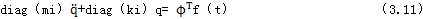 由上式可知:在實(shí)模態(tài)坐標(biāo)系里,用物理坐標(biāo)系描述的運(yùn)動(dòng)微分方程,變成n個(gè)獨(dú)立互不耦合的動(dòng)運(yùn)微分方程。解式(3.11)可確定q,再由式(3.10)可確定物理坐標(biāo)系下的響應(yīng)X(t)。式(3.10)是物理坐標(biāo)系和固有模態(tài)和固有模態(tài)坐標(biāo)系之間相互轉(zhuǎn)換的重要關(guān)系式。