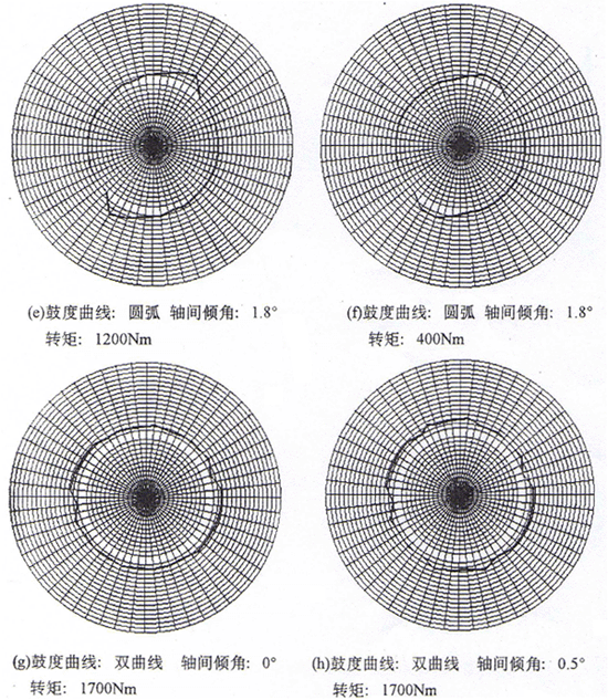 5.圓弧鼓度曲線與優(yōu)化鼓度曲線的測(cè)試結(jié)果相比較,在無(wú)軸間傾角的情況下,二者的最大應(yīng)變無(wú)大的差異,只是分布狀態(tài)有所不同,這是由各種誤差的綜合影響所造成的。當(dāng)軸間傾角逐漸增大,應(yīng)變分布的最大值和最小值之差逐漸增大,但優(yōu)化鼓度曲線的差值變化較圓弧鼓度曲線的要小。當(dāng)軸間傾角超過(guò)設(shè)計(jì)軸間傾角處于最大時(shí),二者的最大應(yīng)變量之比約為2;
