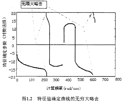 Pilkey和Leckie開發(fā)的用于分析帶分支系統(tǒng)扭振系統(tǒng)的傳遞矩陣法包括將分支系統(tǒng)簡化為一個等效單轉(zhuǎn)子系統(tǒng)。這種方法要求將分支系統(tǒng)的參數(shù)累加在分支系統(tǒng)所屬的軸段上。因為這種方法要求從主傳遞矩陣上消去分支系統(tǒng)的狀態(tài)關(guān)系,這會導致用根搜索法求解時丟到合理的根。如下圖1-2所示的一個頻率范圍內(nèi)的分支系統(tǒng)的特征曲線,因為無限大而略去的特點會導致丟根。