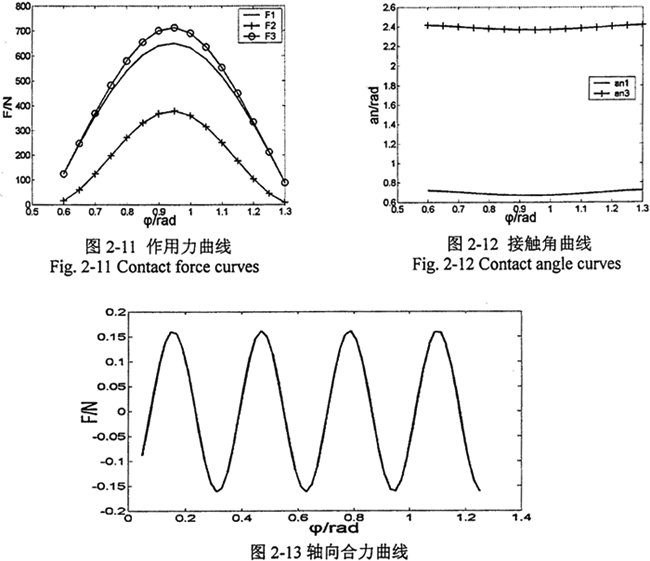 由圖2-11分析可知,在空間正弦軌跡曲線的拐點(diǎn)附近活齒受力最大,且作用在活齒上的三個(gè)力F1、F2、F3中,F(xiàn)3值最大,也就是說(shuō),在進(jìn)行接觸強(qiáng)度計(jì)算的時(shí)候,應(yīng)以活齒與殼體間的接觸情況為主要依據(jù)。接觸角αni(i=1,3)的求解為圓柱正弦活齒傳動(dòng)的結(jié)構(gòu)設(shè)計(jì)提供了必要的條件,它成為正弦滾過(guò)深度bi,(i=1,3)的主要度量依據(jù)。由圖2-13可以看出圓柱正弦活齒傳動(dòng)主動(dòng)軸上的軸向合力幾乎為零,且該傳動(dòng)輸入軸的旋轉(zhuǎn)中心與其幾何中心重合,屬于自平衡結(jié)構(gòu),避免了慣性力的產(chǎn)生。因此只需采用單激波器的結(jié)構(gòu)型式即可使慣性力和作用力達(dá)到平衡,縮短了傳動(dòng)的運(yùn)動(dòng)鏈,減少了動(dòng)力損耗,提高了傳動(dòng)系統(tǒng)的效率和運(yùn)動(dòng)穩(wěn)定性。