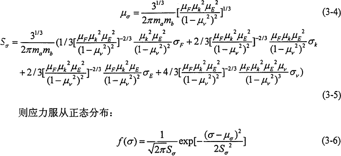 將F、∑k視為隨機(jī)變量,并近似按“3σ”法求出其均值μF、μk與標(biāo)準(zhǔn)差SF、Sk,根據(jù)文獻(xiàn),彈性模量E、泊松比v均為隨機(jī)變量,且近似服從正態(tài)分布,彈性模量的變異系數(shù)對(duì)鋼而言不超過0.03,即彈性模量的標(biāo)準(zhǔn)差為6180MMPa,而泊松比的變異系數(shù)一般在2%-3%左右,則泊松比的標(biāo)準(zhǔn)差為0.009。按可靠度計(jì)算的一次二階矩原理,將齒面接觸應(yīng)力的表達(dá)式在基本變量的平均值點(diǎn)處展開成泰勒級(jí)數(shù),僅取級(jí)數(shù)的線性項(xiàng),則可近似求得應(yīng)力的均值μa與標(biāo)準(zhǔn)差Sσ分別為:
