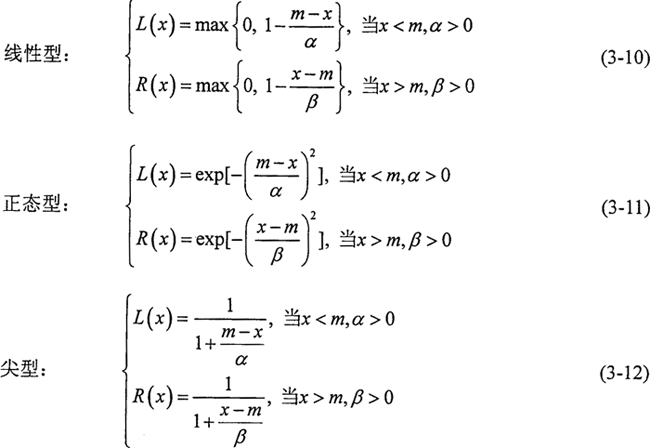 線性型參照函數(shù)在“完全屬于”和“完全不屬于”之間的中介狀態(tài)是線性變化的(圖3-3a),當(dāng)x≤m-α和x≥m+β時(shí),μ=0,說明在(m-α,m+β)區(qū)間之外的數(shù)值完全不屬于該模數(shù)數(shù)。而其他兩種類型的隸屬函數(shù)曲線兩端延伸至無窮遠(yuǎn)(圖3-3b,c)說明整個(gè)數(shù)軸上的任何數(shù)總在一定程度上隸屬于該模糊數(shù)。在選擇參照函數(shù)時(shí),除非有絕對(duì)的把握認(rèn)為該事件發(fā)生的概率在某個(gè)范圍之內(nèi)而選擇線性參照函數(shù),否則,以選取正態(tài)型或尖型為好。