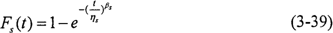 根據(jù)故障樹對圓柱正弦活齒減速器進(jìn)行可靠性的數(shù)字仿真研究。各基本部件壽命分布參數(shù)見表3-5,采用上述算法編程求解。通掃故障樹5000次,產(chǎn)生減速器壽命抽樣值5000個,設(shè)系統(tǒng)最大工作時間Tmax為1000Oh,將Tmax分為1000個區(qū)間,統(tǒng)計(jì)減速器壽命抽樣落入各區(qū)間的次數(shù),得到系統(tǒng)平均壽命,即減速器平均無故障工作時間MTBF為3086h,壽命的方差為6.39×106。根據(jù)仿真結(jié)果進(jìn)行擬合分析,系統(tǒng)壽命服從威布爾分布,即