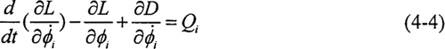 對(duì)轉(zhuǎn)換成鏈狀結(jié)構(gòu)的系統(tǒng),應(yīng)用拉格朗日法建立系統(tǒng)的扭振動(dòng)力學(xué)方程,系統(tǒng)中帶有粘性阻尼,因此列出含有耗散函數(shù)的拉格朗日方程