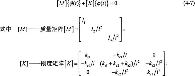 在分析和評(píng)價(jià)減速器系統(tǒng)扭振特性時(shí),需要計(jì)算系統(tǒng)的各階固有頻率以及相應(yīng)的主振型,這就要求解系統(tǒng)的無阻尼自由振動(dòng)方程。當(dāng)系統(tǒng)自由振動(dòng)時(shí),激振力矩和阻尼均為零,此時(shí)系統(tǒng)的動(dòng)力學(xué)方程可表示為