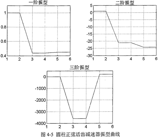 根據(jù)式(4-9)、(4-10)及(4-12)計算出固有頻率、勢能分布率和模態(tài)柔度見表4-2。利用Matlab編制程序還繪制出圖4-5所示的減速器系統(tǒng)的振型曲線。