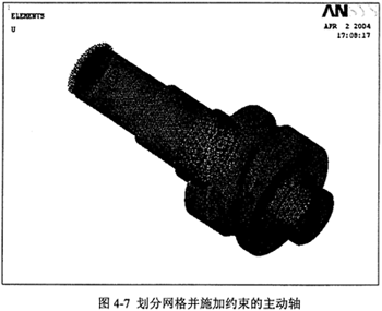 四面體單元每個節(jié)點有三個自由度(Tx,Ty,Tz),通過限制節(jié)點的自由度,對模型施加約束。模擬軸承的作用,在安裝軸承處的零件表面施加約束,首先將表面上所有節(jié)點的坐標由笛卡爾坐標(x,y,z)轉(zhuǎn)換為柱坐標(R,θ,Z),然后限制自由度R。并在主動軸的輸入軸端面和導架的輸出軸端面,限制所有節(jié)點的自由度。劃分網(wǎng)格并施加約束的主動軸見圖4-7。