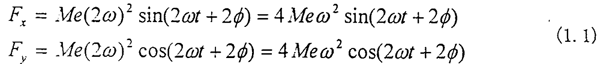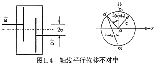 不對(duì)中具有一些典型的特征,如不對(duì)中比較嚴(yán)重時(shí)會(huì)使軸承的油膜壓力偏離正常值,聯(lián)軸器不對(duì)中時(shí)聯(lián)軸器兩端軸承的振動(dòng)較大,軸心位置不穩(wěn)定,而且在振動(dòng)頻譜中二倍頻分量幅值較大等。而對(duì)于齒輪聯(lián)軸器不對(duì)中產(chǎn)生倍頻振動(dòng)分量的機(jī)理研究又是其中的一個(gè)重點(diǎn)。文獻(xiàn)[68]指出,由于安裝時(shí)轉(zhuǎn)子軸心線不對(duì)中引起的振動(dòng),在用電機(jī)驅(qū)動(dòng)的轉(zhuǎn)子系統(tǒng)中,當(dāng)電機(jī)軸與負(fù)載機(jī)械由齒輪聯(lián)軸器連接時(shí),電機(jī)軸存在二倍頻的振動(dòng),而在單獨(dú)運(yùn)動(dòng)時(shí),倍頻振動(dòng)立即消失,這表明倍頻振動(dòng)完全是齒輪聯(lián)軸器耦合的結(jié)果。文獻(xiàn)[64,65]解釋了由于齒輪聯(lián)軸器不對(duì)勁中而產(chǎn)生二倍頻振動(dòng)的機(jī)理,以[65]中的軸線平行位移不對(duì)中為例見(jiàn)圖1.4,圖中ω為轉(zhuǎn)子的轉(zhuǎn)動(dòng)的解速度,2e為不對(duì)中量,M為內(nèi)齒套的質(zhì)量,φ0為起始回轉(zhuǎn)角。